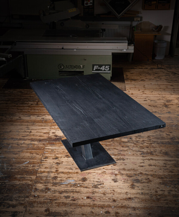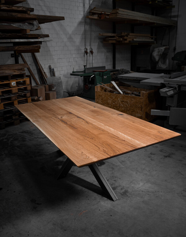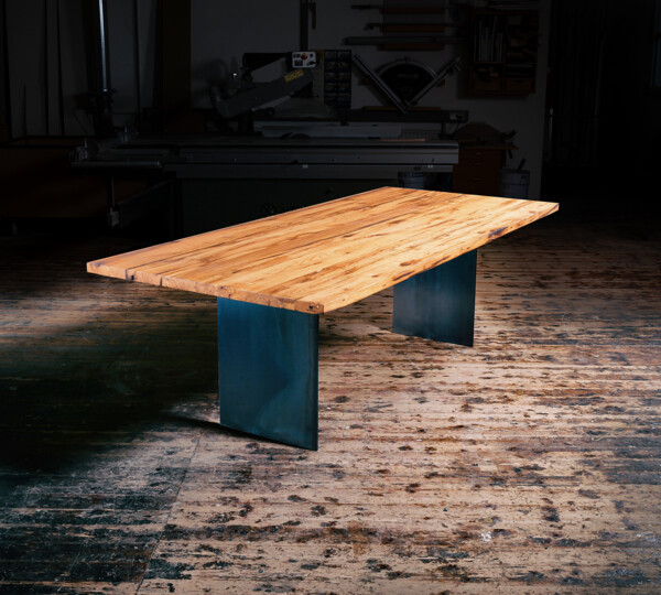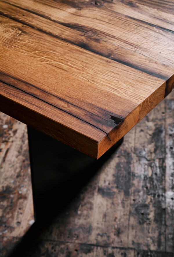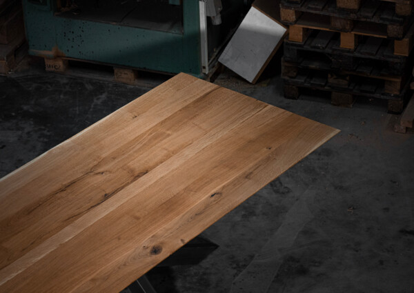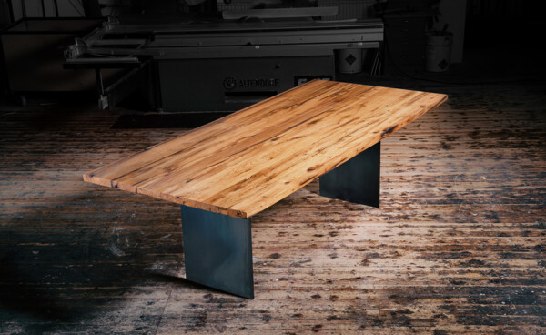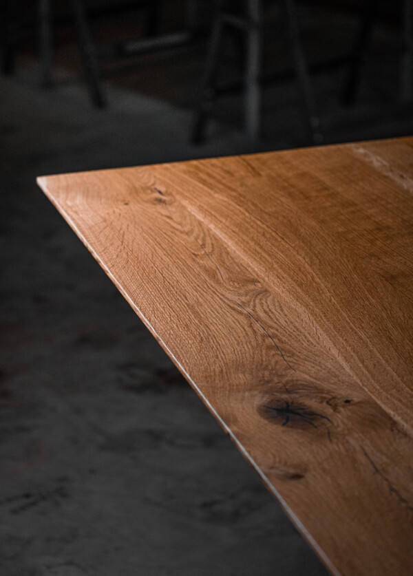 Diese Tischvariante ist simpel gestaltet und besteht aus drei bis fünf Bohlen, die ganz individuell angepasst werden können. Die massiven Bohlen, die deutlich von der Natur geprägt sind, werden sorgfältig sortiert und ihren charakteristischen Eigenschaften zugeordnet. Risse und Astlöcher werden per Hand bearbeitet und können entweder verschlossen oder natürlich offen gelassen werden.